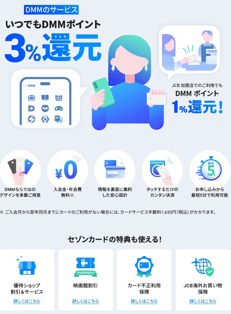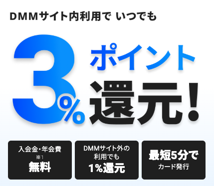 最短5分発行|年会費無料|今すぐお得なポイント生活をスタート 無料でDMM JCBカード申込 DMM JCBカードの魅力 DMMユーザーなら作らないと損!お得にポイントが貯まるクレジットカード ■DMM JCBカードの特徴 ・入会金・年会費がずっと無料 ・DMMサイト利用でいつでも3%ポイント還元 ・DMMサイト以外でも1%ポイント還元 ・最短5分でデジタルカード発行 ・発行後すぐにDMMアカウントへ自動登録 ■こんなメリットがあります ・DMM利用で効率よくポイントが貯まり実質お得に利用できる ・普段の買い物でもポイントが貯まり無駄がない ・年会費無料なので気軽に持てる ・最短5分発行だから今すぐ使える ・DMMユーザーなら支払いをまとめて管理できる 商品名 DMM JCBカード カテゴリ カード発行