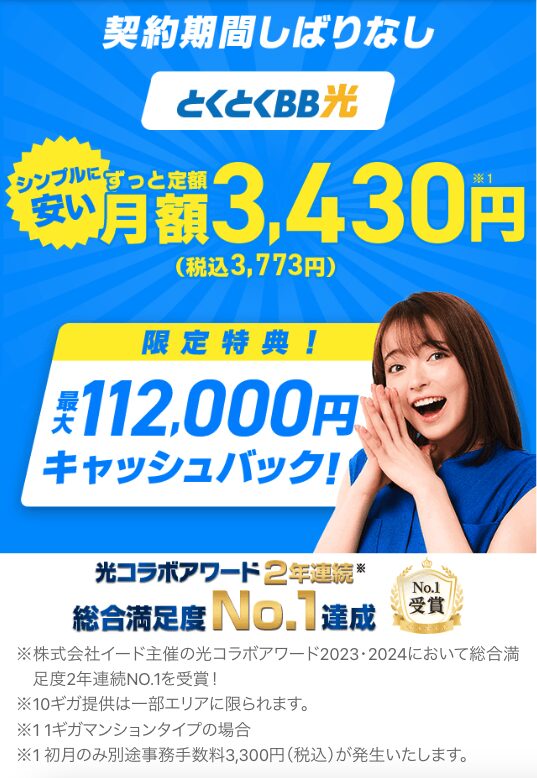 最短1分で申込み完了|今なら特典適用中 今すぐ最大キャッシュバックを受け取る GMOとくとくBB光が選ばれる理由 高速・安定の光回線だから、テレワークも動画視聴もストレスフリー。 さらに高額キャッシュバックで、実質負担をグッと抑えられます。 ・最大級の高額キャッシュバック特典 ・工事費実質無料で初期費用を軽減 ・IPv6対応の高速&安定通信 ・違約金負担特典ありで乗り換えも安心 ・全国対応で幅広いエリアをカバー \最短1分で申込み完了|今なら特典適用中/ 商品名 GMOとくとくBB光 カテゴリ 今だけお得