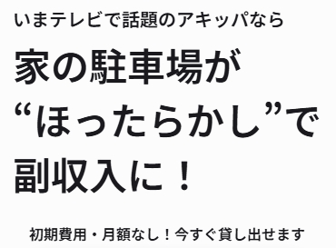 最短1分で無料登録完了|費用は一切かかりません 無料で駐車場オーナー登録する 使っていない駐車場が“毎月の収入源”に変わる ・初期費用0円・登録無料ですぐに始められる ・スマホやPCから簡単に貸し出し設定が可能 ・空いている時間だけ貸せるから自宅駐車場でもOK ・全国で多数の利用実績がある安心のサービス ・集客・決済はakippaが代行するので手間いらず → 放置しているスペースが安定した副収入になり、家計にゆとりが生まれます 商品名 akippa(アキッパ) カテゴリ 賃貸物件