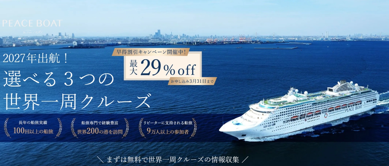 早期予約特典あり|人気日程は早めのチェックがおすすめ 今すぐ最新クルーズ情報を見る 世界を巡りながら、新しい自分に出会う旅へ 一度は憧れる世界一周。 飛行機移動とは違う、 ゆったりとした時間の中で 複数の国と文化を体験できます。 ・日本発着で安心の船旅 ・長期滞在型だからこそ味わえる深い異文化交流 ・船内イベントや講演も充実 ・一度の荷造りで世界各国へ “ただの旅行”ではなく、 人生観が変わる体験を求める方に選ばれています。 まずは無料資料請求から。 強引な勧誘はありません(約1分で完了) 商品名 ピースボート世界一周クルーズ カテゴリ 旅