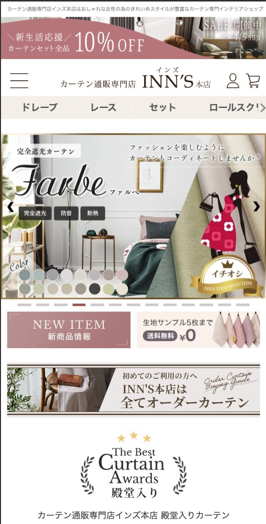 今だけ無料|生地サンプルで失敗ゼロのカーテン選び 無料サンプルを今すぐ取り寄せる 毎日目に入る景色を、私らしく美しく 国内有名メーカー&厳選オリジナルデザイン 甘すぎないフェミニン・洗練されたシンプルデザイン オーダーカーテンと同じ縫製仕様&美しいプリーツ加工 生地サンプル無料送付で事前確認OK 採寸方法も丁寧に解説、初めてでも安心 ■こんなお悩みありませんか? ・大手チェーンでは理想のデザインが見つからない ・見本帳のカーテンは高すぎて手が出ない ・おしゃれで品質も妥協したくない 当店は“品質と価格のバランス”を大切にしたセレクトショップ。 部屋の印象を格上げし、帰るたびに気分が上がる空間へ。 毎日の暮らしに、さりげない上質を。 今だけ無料|生地サンプルで失敗ゼロのカーテン選び 商品名 インズ カーテン カテゴリ 今だけお得