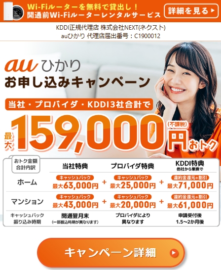 最短5分で申込完了|今だけ限定特典あり 今すぐ最大特典を確認する auひかりをお得に申し込むなら 「通信費を少しでも安くしたい」 「特典が多い窓口から申し込みたい」 そんな方へ。 auひかりキャンペーン窓口なら、 高額キャッシュバックや違約金還元特典で、 初期費用の負担を抑えてスタートできます。 ・最大高額キャッシュバック特典あり ・他社解約違約金の還元サポート ・au/UQモバイルとのセット割対応 ・高速・安定の独自回線 → 初期費用を抑えつつ、毎月の通信費も節約。 スマホとまとめて管理できるので、家計の固定費をスッキリ削減できます。 商品名 auひかりキャンペーン窓口 【商品番号m039 】 カテゴリ ネット回線開通