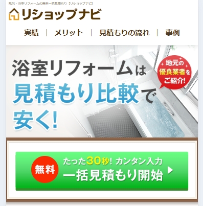 完全無料|最短数分で依頼完了・しつこい営業なし 無料で一括見積もりを依頼する お風呂リフォーム、いくらかかるか不安ではありませんか? 「相場がわからない」 「業者選びで失敗したくない」 そんな不安を抱えたまま、後回しにしていませんか? リショップナビなら、 複数のリフォーム会社から無料で一括見積もり。 価格・プラン・保証内容を比較できるから、 納得して選べます。 ・厳選された優良リフォーム会社のみ紹介 ・複数社の見積もりを無料で比較 ・専任コンシェルジュがサポート ・断り代行サービスありで安心 → 比較するだけで、数十万円差が出ることも。 ムダな出費を防ぎ、理想のお風呂を賢く実現しませんか? 商品名 リショップナビ(お風呂リフォーム) 【商品番号m055 】 カテゴリ 不動産